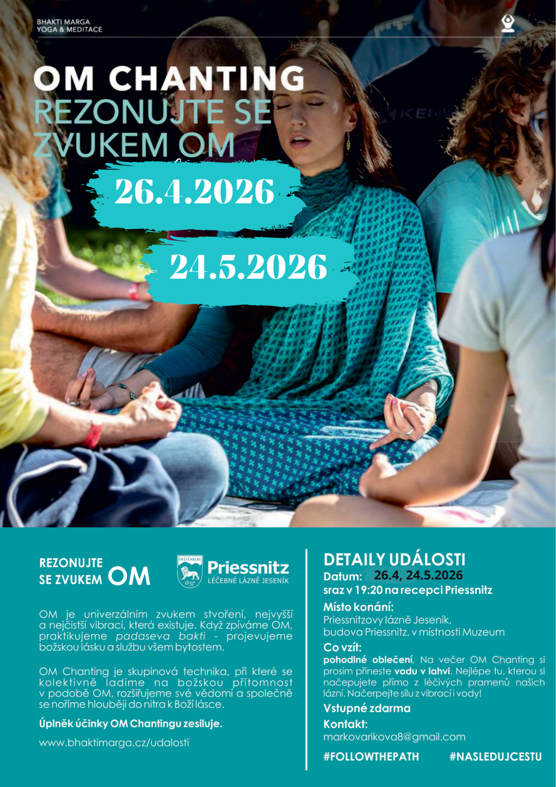 Rezonujte se zvukem OM. OM Chanting je skupinová technika, při které se kolektivně ladíme na božskou přítomnost v podobě OM, rozšiřujeme své vědomí a společně se noříme hlouběji do nitra k Boží lásce. S sebou pohodlné oblečení a NĚCO NA PITÍ (načepujte třeba vodu z některého lázeňského pramene ). OM Chanting vede MUDr. Martina Kovaříková. Vstup volný