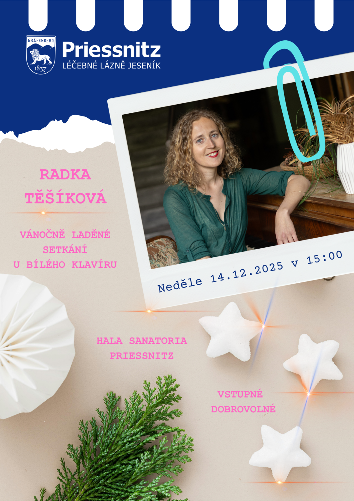 VÁNOČNĚ LADĚNÉ SETKÁNÍ U BÍLÉHO KLAVÍRU (Koncerty) 14.12.2025 od 15:00 do 16:00 hod. Priessnitzovy léčebné lázně a.s., Hala lázeňského domu Priessnitz, Jeseník | Mapa Vánoční repertoár klavíristky, zpěvačky, autorky písní Radky Těšíkové. Vstupné dobrovolné. | |