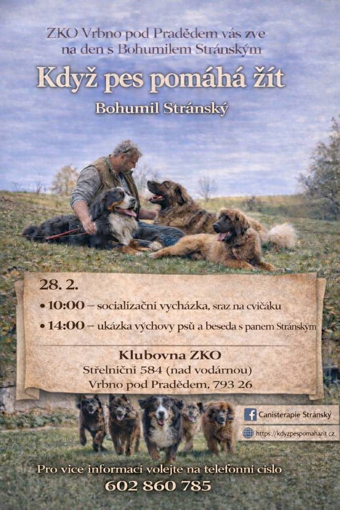 Beseda a socializační vycházka s Bohumilem Stránským. Ukázka výchovy psů a beseda