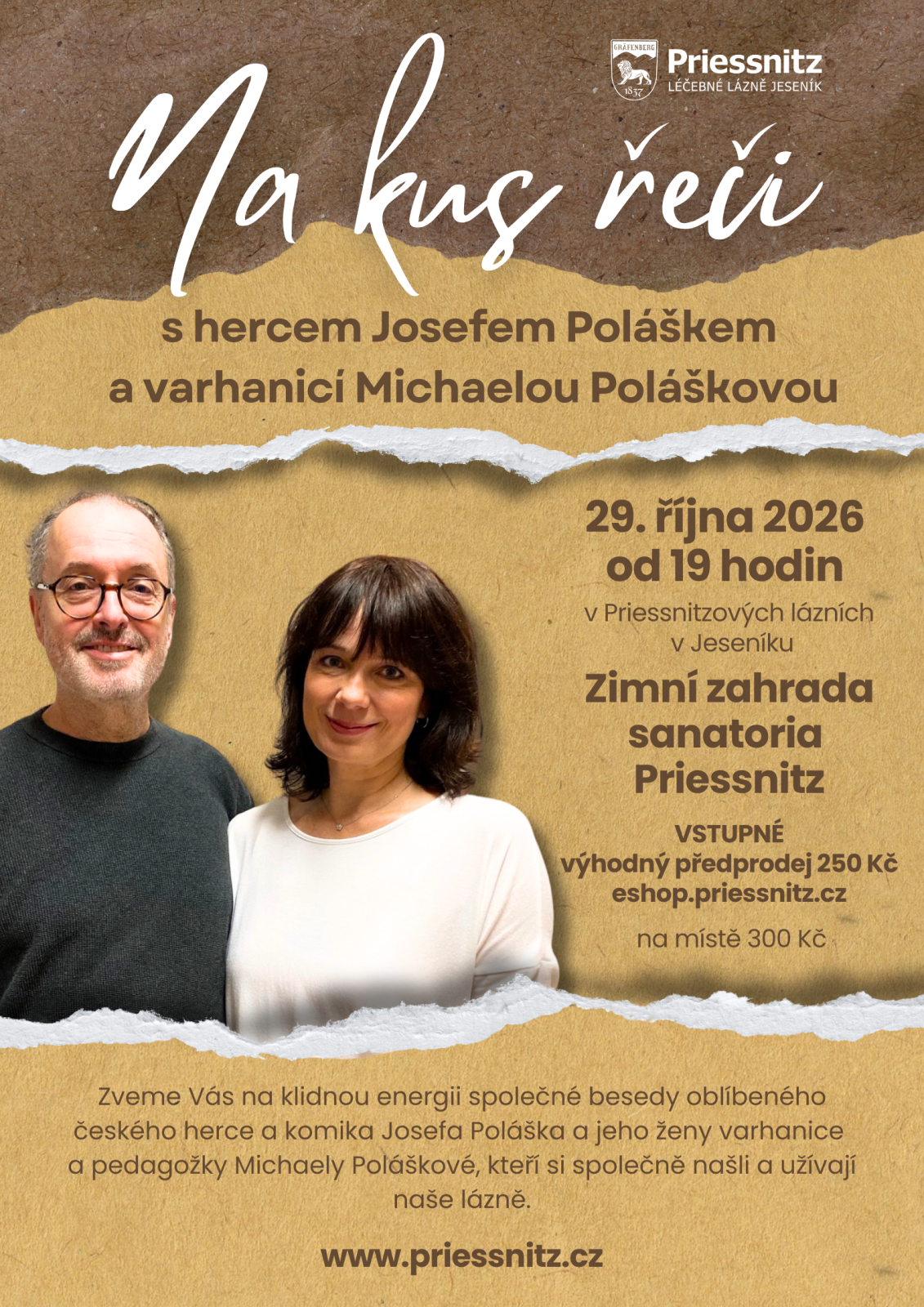 Zveme Vás na klidnou energii společné besedy oblíbeného českého herce a komika Josefa Poláška a jeho ženy, varhanice a pedagožky Michaely Poláškové, kteří si společně našli a užívají naše lázně. VSTUPENKY: Předprodej na www.eshop.priessnitz.cz za výhodnou cenu 250 Kč. Na místě 300 Kč.