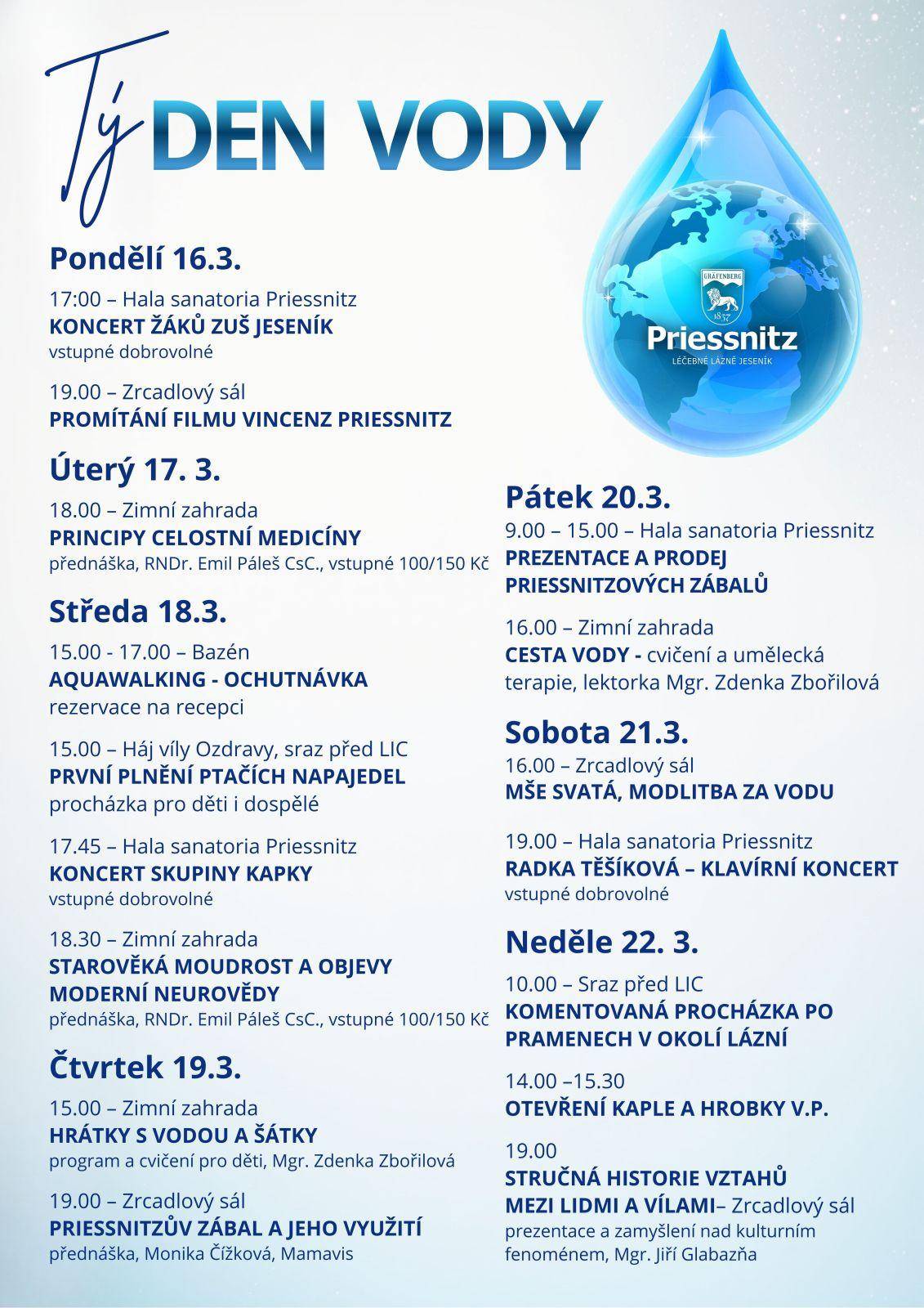 22. březen je významný den pro všechny na planetě, protože na tento den připadá SVĚTOVÝ DEN VODY. Připojte se k oslavám Světového dne vody a vyberte si z bohatého programu, vytvořeného Priessnitzovými léčebnými lázněmi k tomuto významnému dni. Akce se konají na různých místech PLL - viz podrobný program. Neděle 22. března. od 14.00 do 15.30 Sraz před LIC Otevření kaple a hrobky Vincenze Priessnitze. U příležitosti Světového dne vody nabízíme možnost prohlédnout si novogotickou památku, která slouží jako místo posledního odpočinku zakladatele moderní vodoléčby.