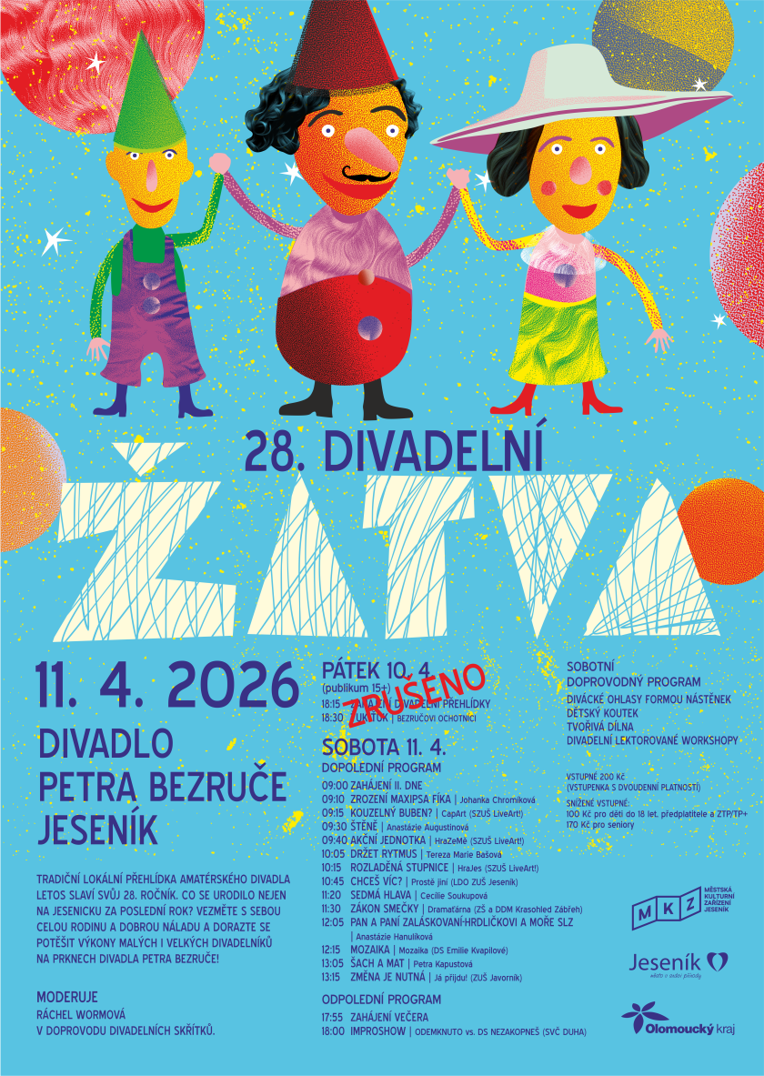 | 02.04.2026 od 08:00 do 16:00 hod. Galerie Zlatá 92, Zlaté Hory | MapaSRDEČNĚ VÁS ZVEME NA VÝSTAVU ŽÁKOVSKÝCH VÝTVARNÝCH PRACÍ. Vernisáž proběhne dne 10.3.2026 od 17:00 hodin. | |